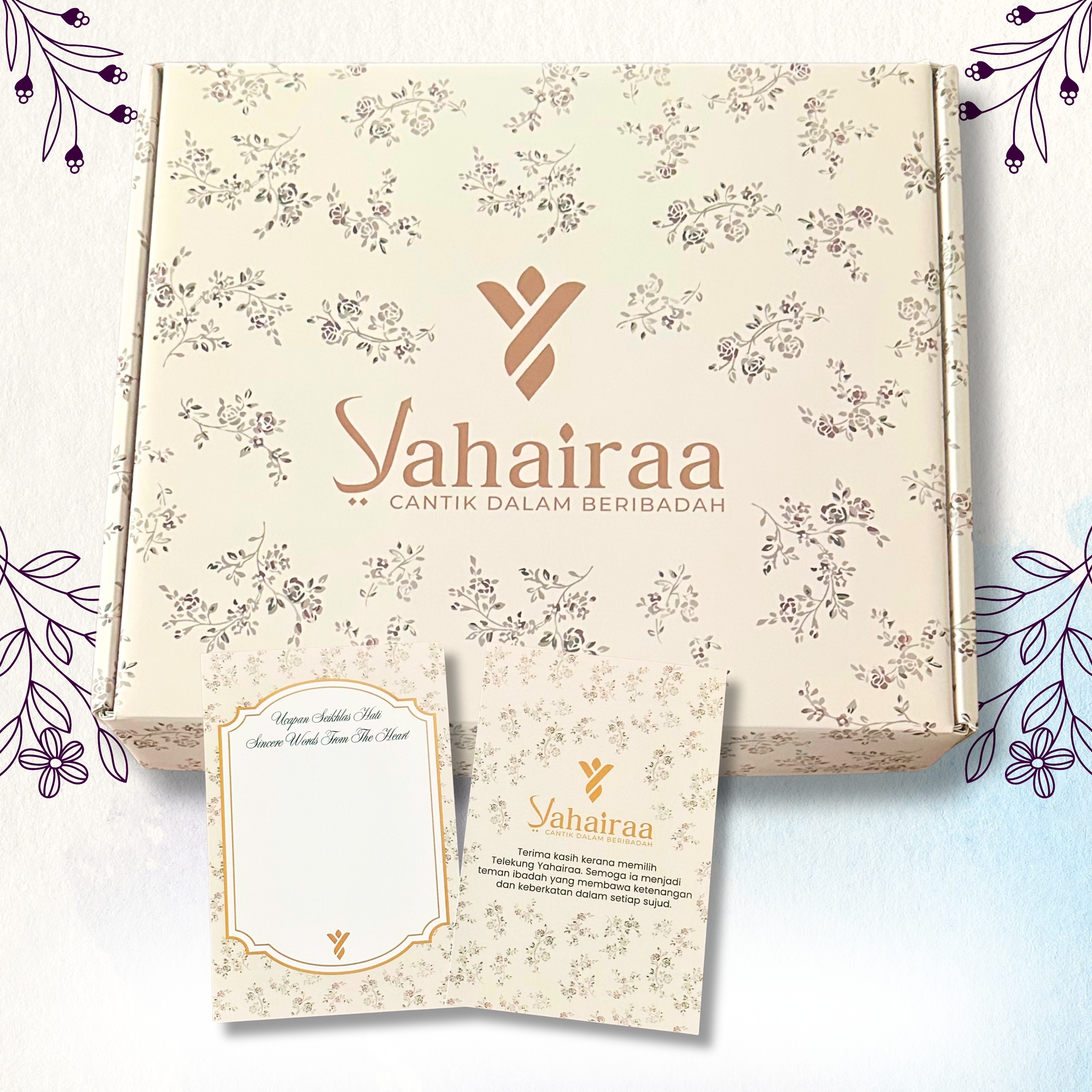 Specially designed to complement every Telekung Yahairaa purchase, this exclusive gift box features a soft floral motif that reflects elegance, serenity, and the gentle essence of ibadah